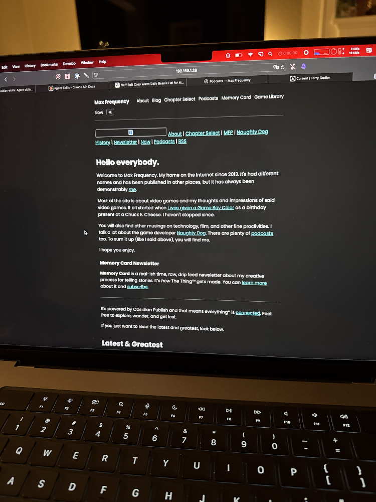 The next day or two was a hyperfocused blur of tuning and getting the site dialed in. Fervent back and forth with Claude. After getting the shape of it, I decided to spend the following days, weeks co-publishing to the platform and Obsidian Publish. You notice missing elements and breaks this way. For example, the RSS feed was only sharing blog posts, not podcasts, newsletters, etc., or how callouts were jank and the Game Library entries weren't formatting correctly.
