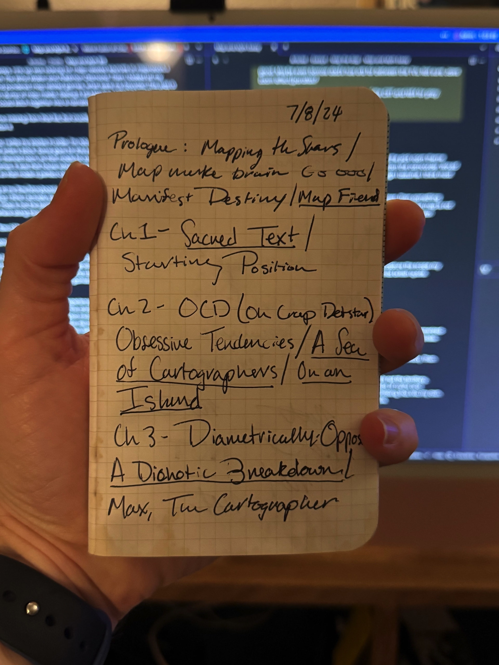 My favorite of the bunch is "Chapter 3: A Dichotic Breakdown." I love the word play with "a psychotic breakdown" and how it represents the dichotomy I mention having with my guide work and the games I played. "Chapter 2: A Sea of Cartographers" is a close (and ironic) second.
